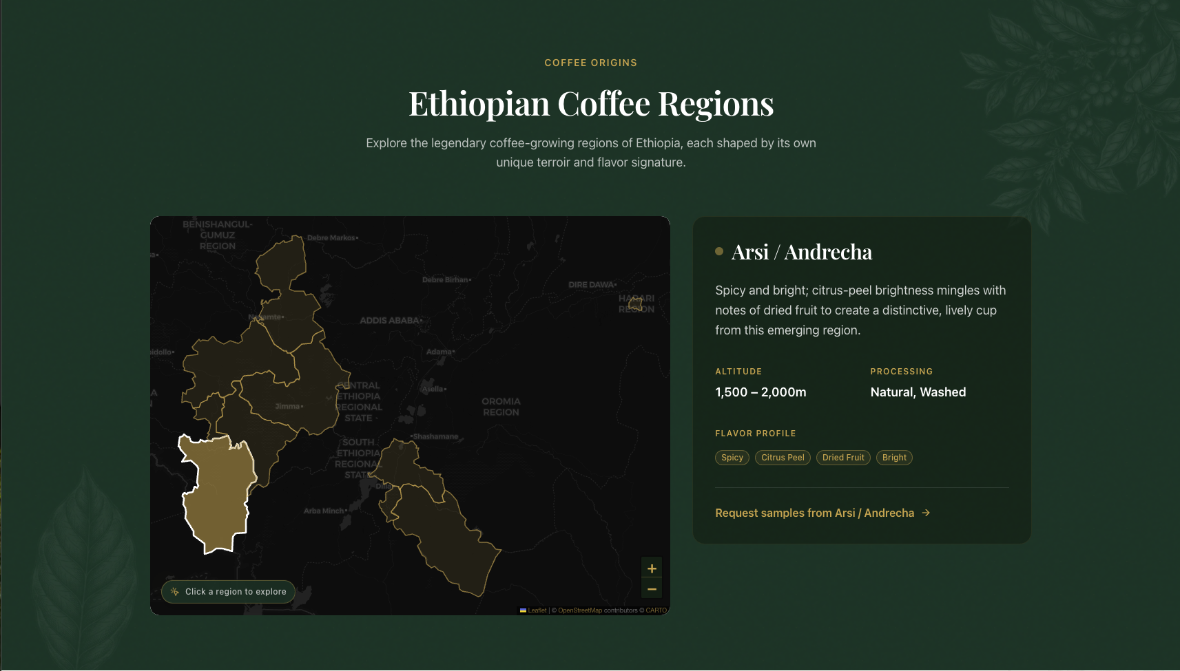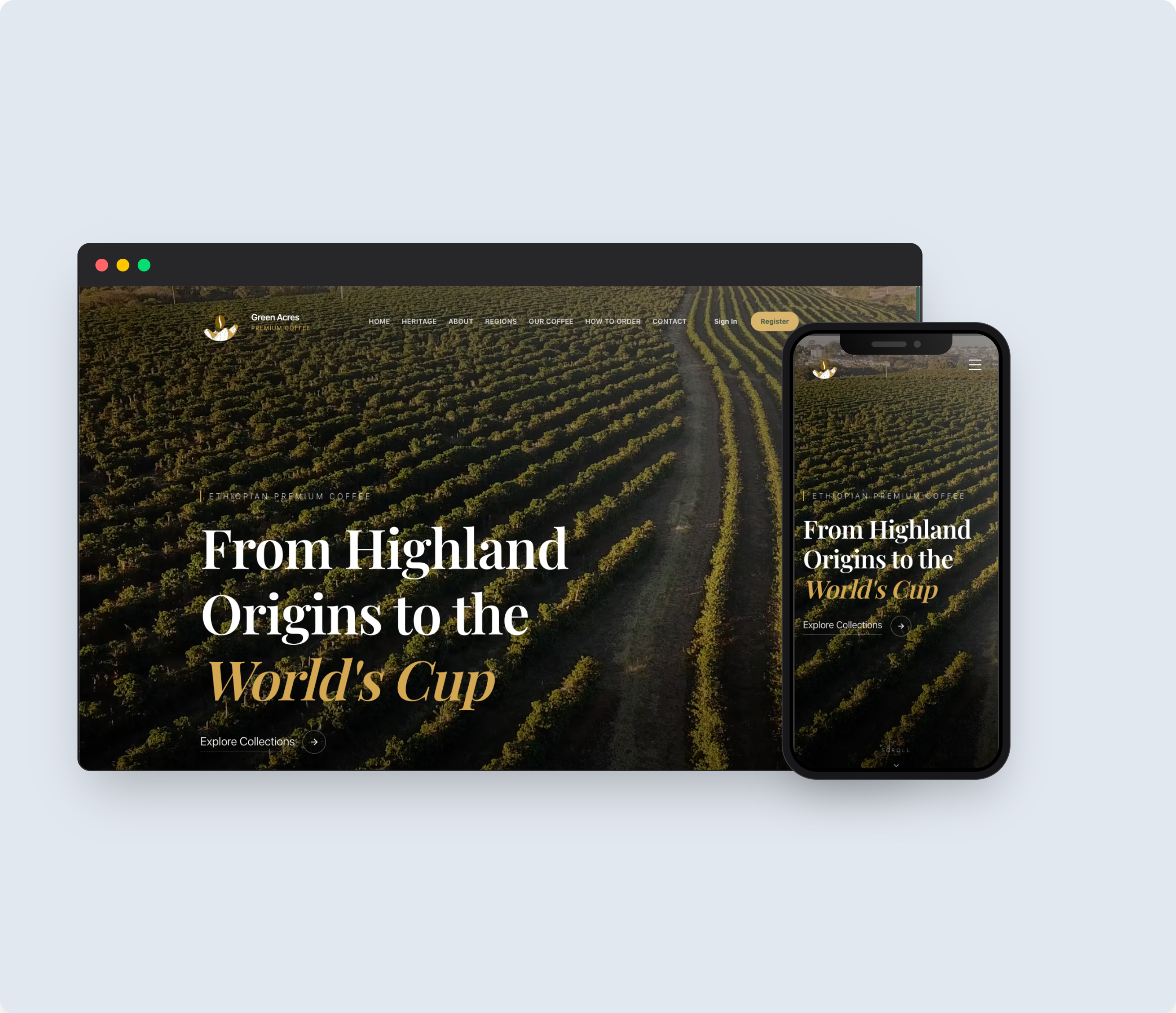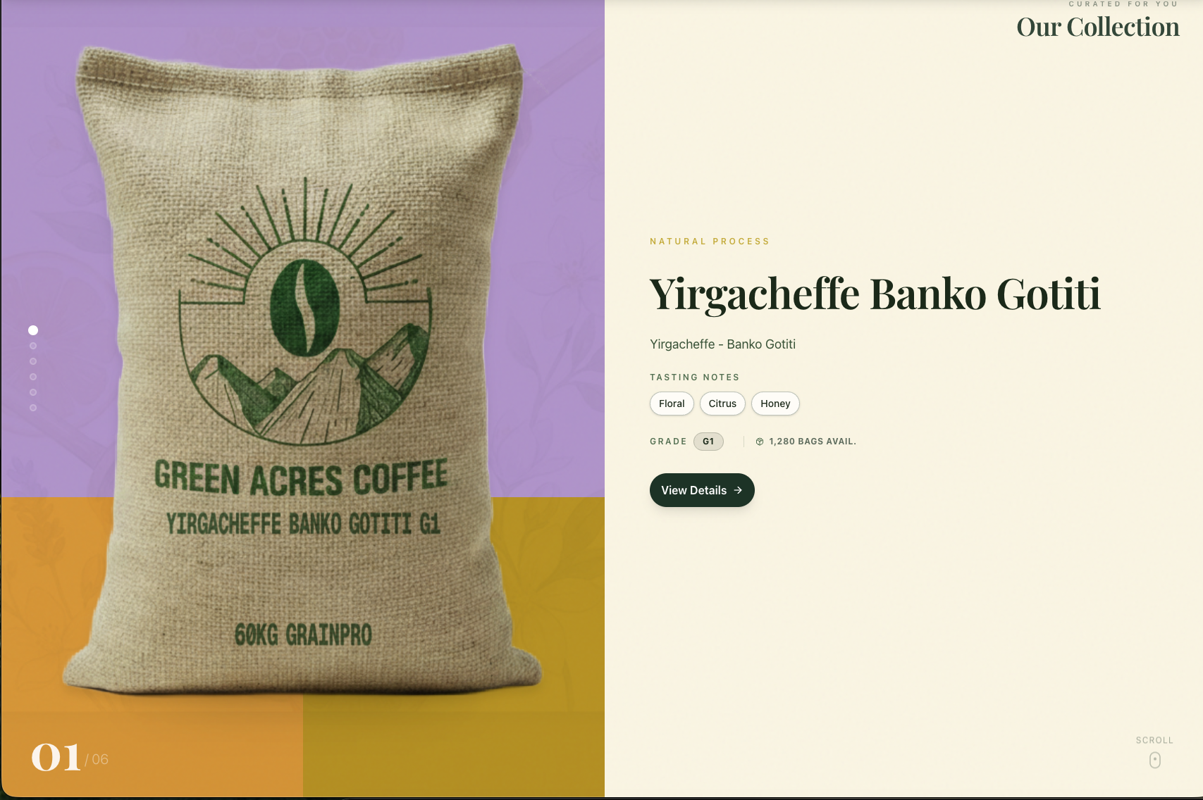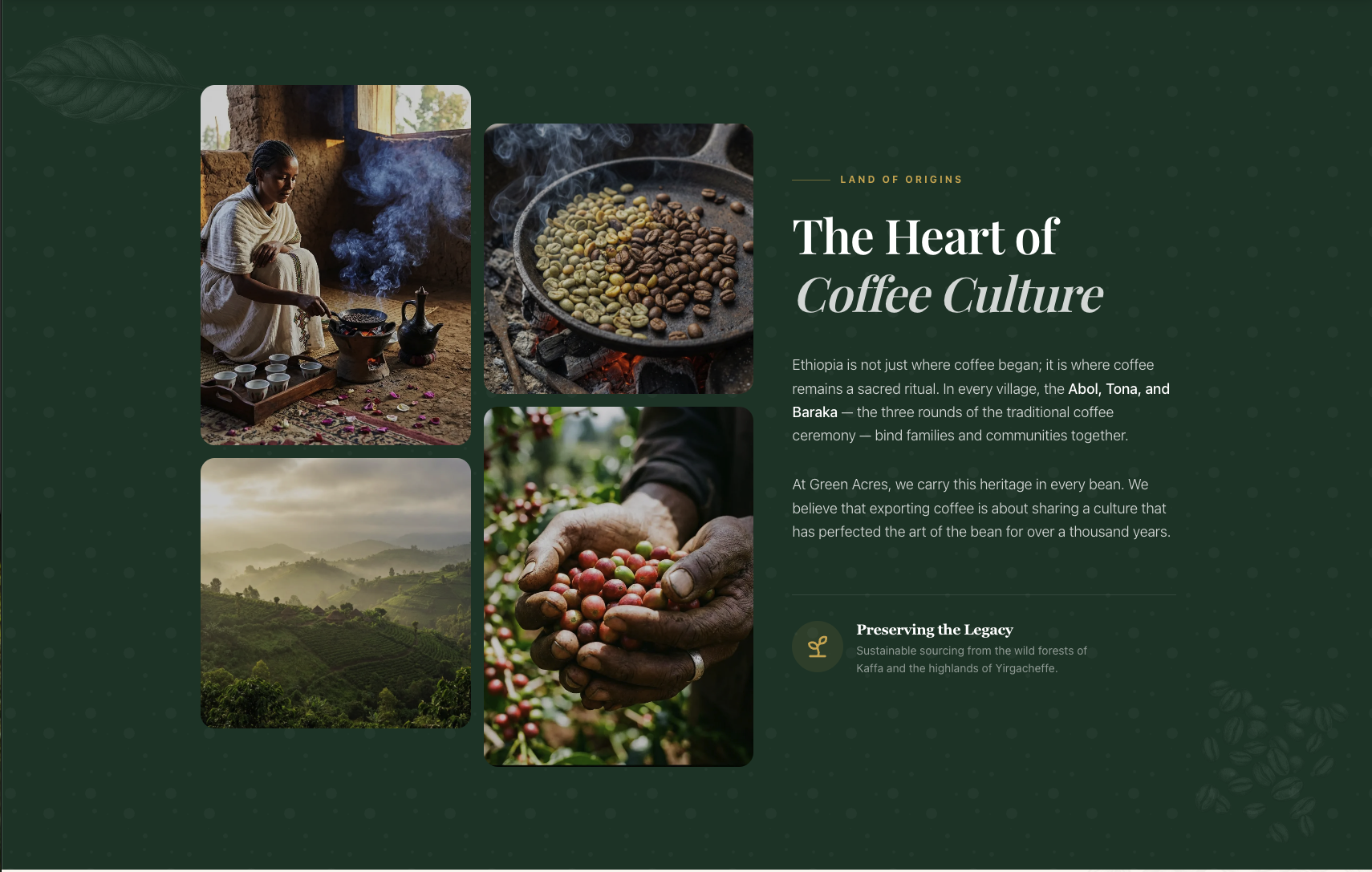 The marketing website tells the Green Acres story with an immersive, cinematic design — featuring an interactive Ethiopian Coffee Regions map, a heritage section rooted in Ethiopian coffee culture, and a scrollable collection showcase — establishing the brand as a premium origin exporter on the world stage.