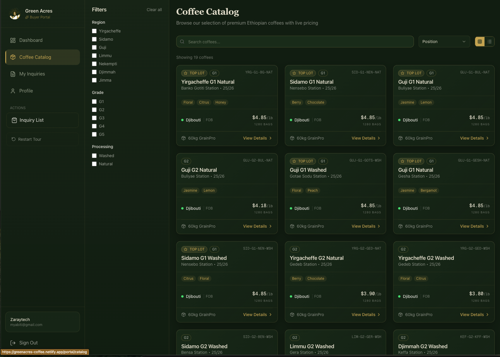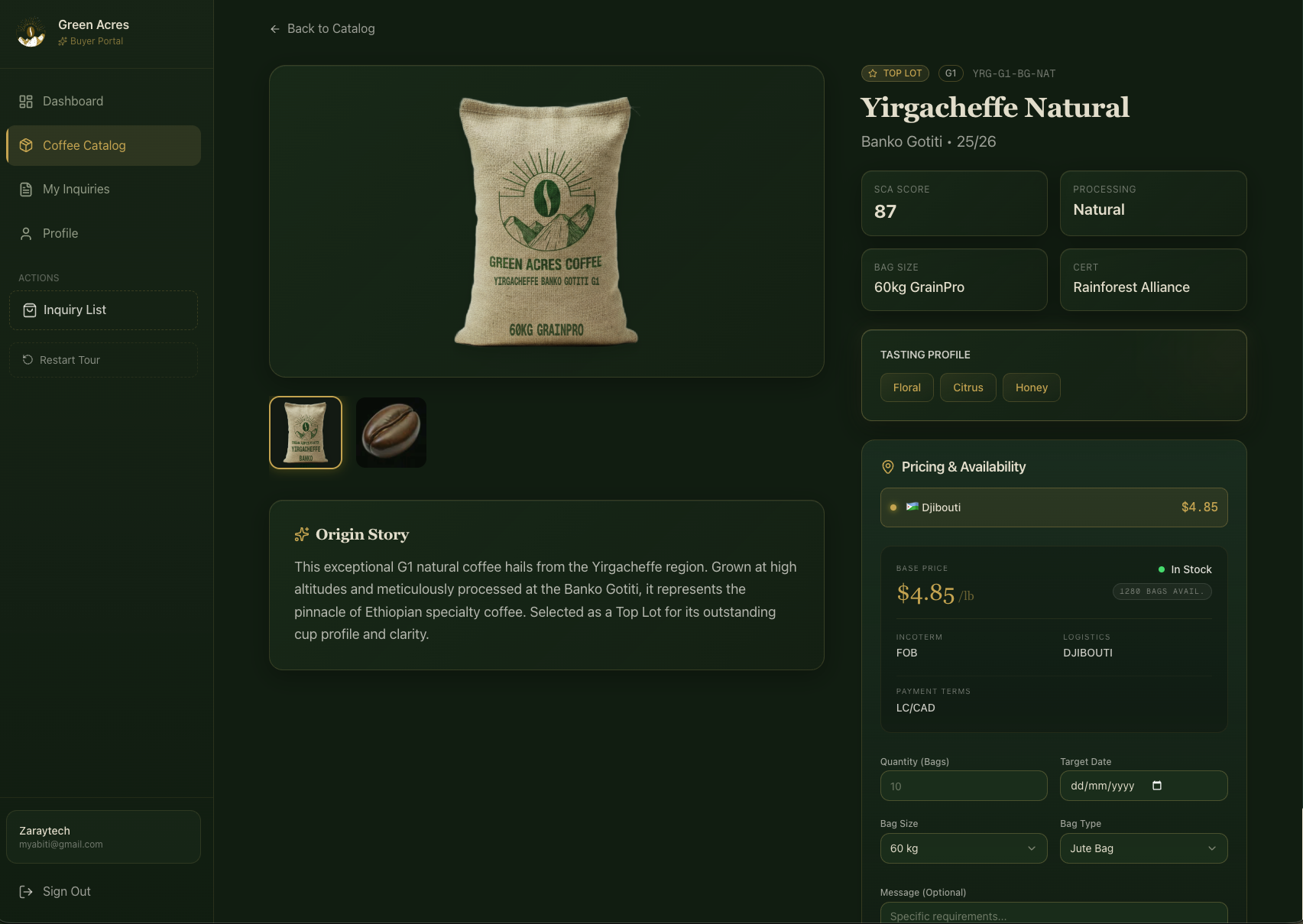 The buyer portal gives verified buyers access to a live catalog of 19+ regional lots across Yirgacheffe, Sidamo, Guji, and other prized Ethiopian origins. Each lot includes SCA scores, processing method, tasting profiles, bag sizes, port pricing, and real-time availability — all managed through the admin dashboard. Buyers can filter by region, grade, and processing method, then submit inquiries directly through the platform.